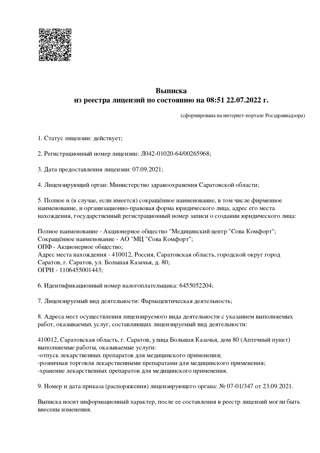 Наименование, адрес места нахождения и телефон лицензирующего органа - Министерство здравоохранения Саратовской области - г. Саратов, ул. Рабочая, 145/155, тел. (8452) 67-07-02; 67-06-22.